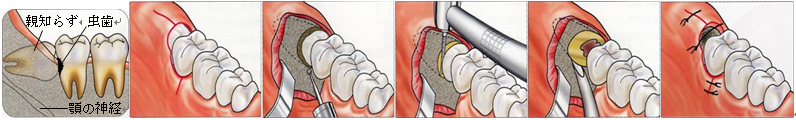 ①麻酔 ➔ ②切開する ➔ ③骨を削除する ➔ ④歯を分割する ➔ ⑤抜歯 ➔ ⑥歯肉を縫合する