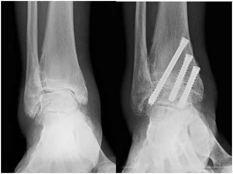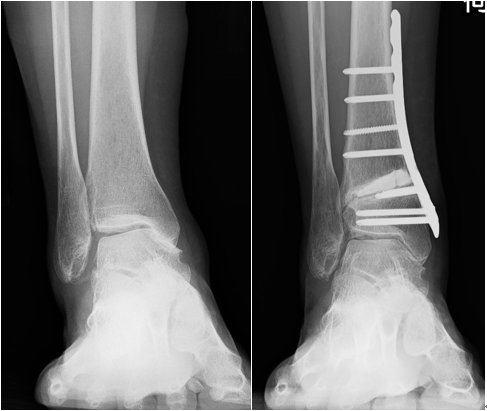 足関節固定術は、最も一般的な変形性足関節症の手術療法です。残存する軟骨を削り、スクリューなどで足関節を固定します。