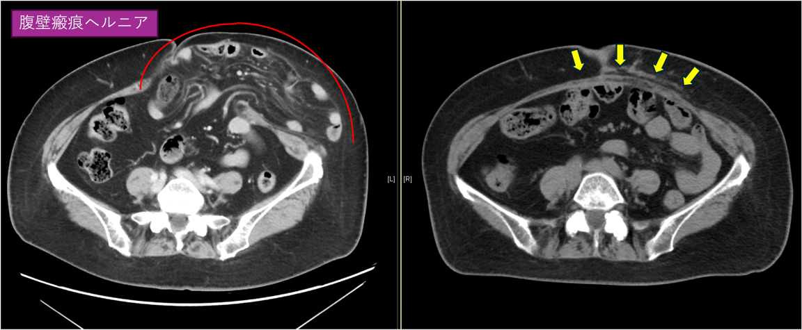図2(CTスキャン):腹壁瘢痕ヘルニア(赤線)、修復後(黄色矢印)