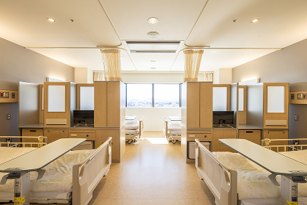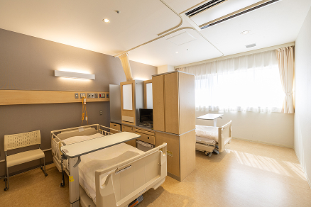 プライバシーに配慮したシンプルな個室で、ゆっくりお過ごしいただけます。お見舞いのご家族と周囲に気兼ねなくお話しできます。全ての部屋に壁掛けタイプの大型テレビ(42インチ)を設置し、用途の広いサイドテーブルをご用意いたしました。ご自分だけのくつろぎの空間をお過ごしください。